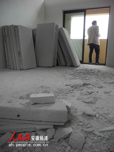 昨天上午,在合肥市潜山路华邦光明世家小区13#楼的门口,一大群业主围在楼道口,七嘴八舌地描述房屋质量存在重大问题,尤其是室内承重隔离板所用的板材,一跺就断、一掰就碎,湿了水之后更是一捏就成粉末状,看了令人触目惊心。