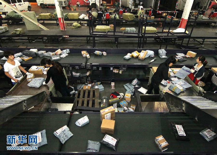 11月9日,位于上海市的圆通速递上海转运中心,工作人员忙碌地分拣快递物品。新华社记者 陈飞 摄
