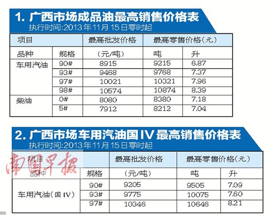 广西新闻网-南国早报南宁讯 (记者肖世艳)今天,广西成品油价格将与全国同步下降。南国早报记者11月14日从自治区物价局了解到,价格调整后,93号汽油每升售价为7.37元,97号汽油每升售价为7.96元(具体价格见附表1)。同时,由于目前北海、梧州、贺州和贵港已经完成国Ⅳ油品升级置换,该局还同步下达了我区汽油质量升级实行优质优价有关事项通知,决定从11月15日零时起,对我区升级至第四阶段的国Ⅳ车用汽油,实行优质优价。