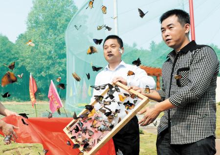 在亚洲最大的蝴蝶观赏网棚里放飞蝴蝶,里面有近万只蝴蝶供游客观赏。 石祯专摄
