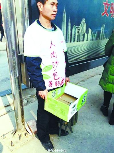 昨天下午,记者来到武昌亚贸公交车站看到,这名男子依然站在公交站前,手上捧着的纸箱里有些纸币。男子上身套着一件白色T恤,上面写有“人肉沙包、10元一拳”,“筹款救子”等字样。