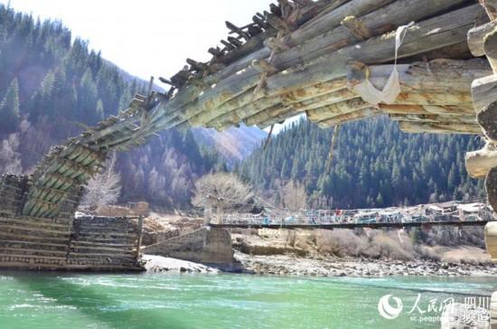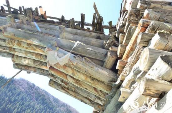 在阿坝州阿坝县境内,有20多座保存完整的百年木制老桥——伸臂桥。该桥除了原木和石块,没有一颗铁钉和其他材料。该桥已有上百年历史,被称为藏区的“历史桥”。