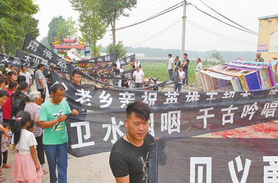 在关键时刻舍己救人的河南小伙王超杰走了。在白发父母的相送下,在仍然牙牙学语的女儿哭声中,在两千多父老乡亲的挥泪送别下。昨日上午10时,新乡卫辉唐庄镇六庄店村,哀乐震天,是为王超杰遗体告别仪式。王超杰的灵堂旁,摆满了各方人士敬献的花圈、花环。亲属、同学、老师、群众。一个个、一群群,前往悼念。(记者 宁田甜 实习生 蒿菁菁 文 平伟 摄影 大河网-大河报)
