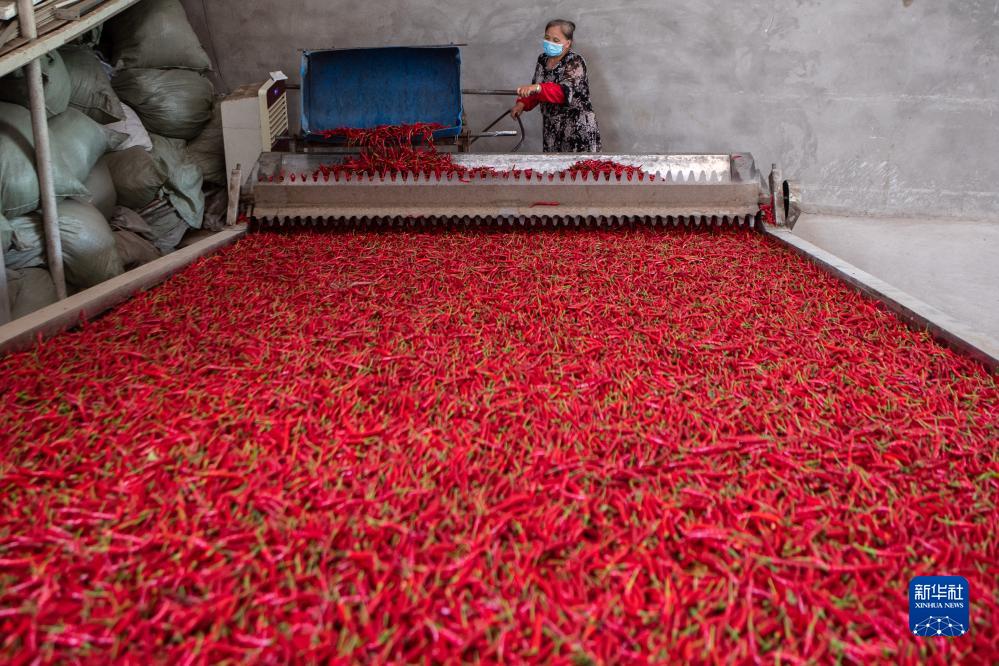 8月15日,工作人员在重庆市石柱土家族自治县龙沙镇一家辣椒专业合作社把新鲜辣椒倒入烘干机。新华社记者 储加音 摄