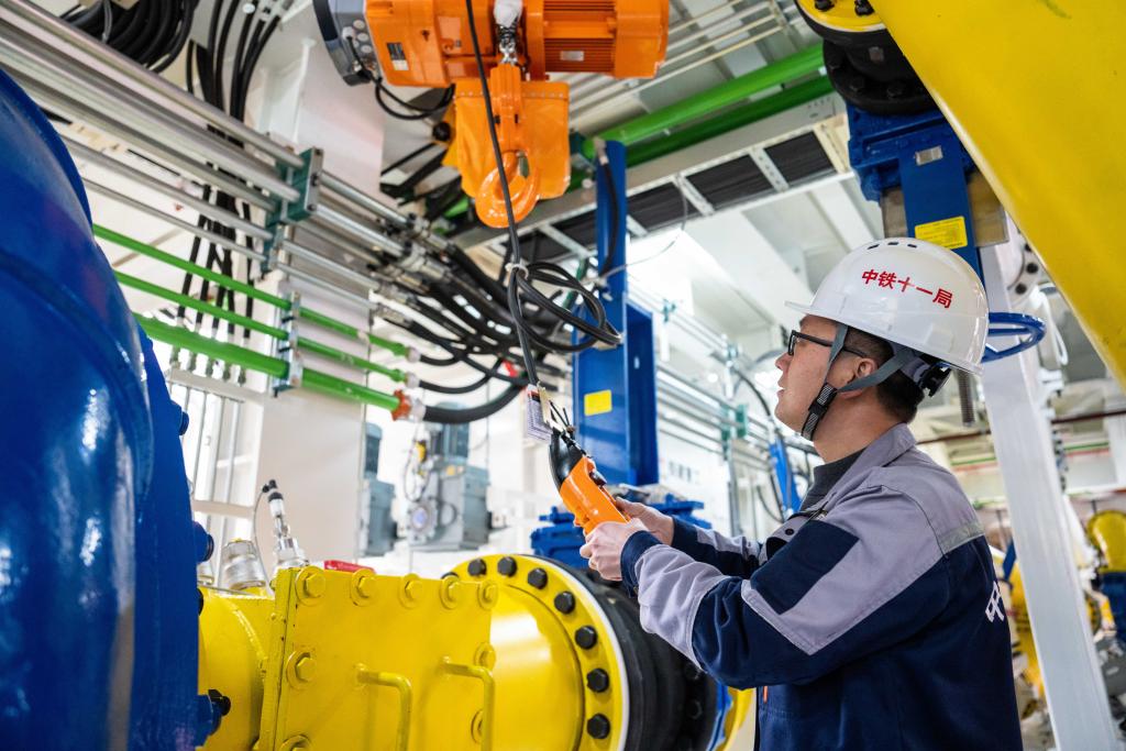 2024年1月10日,在铁建重工长沙第一产业园,工人在调试“定海号”超大直径盾构机。新华社记者 陈思汗 摄