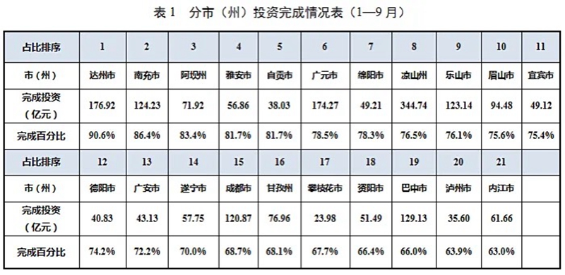 此外,全省21个市(州)中有11个市(州)超过序时进度75%。其中,达州市、南充市、阿坝州完成情况较好,分别完成年度目标90.6%、86.4%、83.4%;凉山州、达州市、广元市3个市(州)完成投资额较高,分别完成344.74亿元、176.92亿元、174.27亿元。