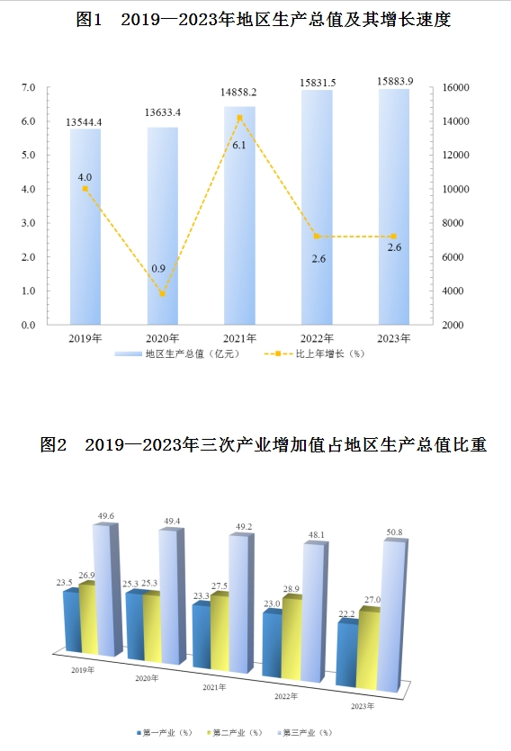 国民经济。初步核算,2023年全省实现地区生产总值(GDP)15883.9亿元,按不变价格计算,比上年增长2.6%。其中,第一产业增加值为3518.3亿元,增长2.6%;第二产业增加值为4291.3亿元,下降2.3%;第三产业增加值为8074.3亿元,增长5.0%。三次产业结构为22.2:27.0:50.8。全年人均地区生产总值51563元,比上年增长3.6%。