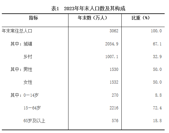 常住人口。据2023年5‰人口变动抽样调查显示,全省年末常住总人口3062万人,其中,城镇人口2054.9万人,乡村人口1007.1万人。常住人口城镇化率为67.1%,比上年提高0.9个百分点。0—14岁人口占全省总人口的比重为8.8%,65岁及以上人口占全省总人口的比重为18.8%。
