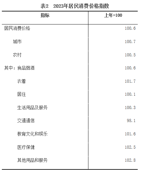 物价水平。全年居民消费价格比上年上涨0.6%,其中城市上涨0.7%,农村上涨0.5%。从商品类别看,食品烟酒上涨0.6%,衣着上涨1.7%,居住上涨0.1%,生活用品及服务上涨0.3%,交通通信下降1.9%,教育文化和娱乐上涨1.6%,医疗保健上涨2.5%,其他用品和服务上涨2.8%。工业生产者出厂价格比上年下降4.3%,其中生产资料价格下降5.8%,生活资料价格与上年持平。工业生产者购进价格下降2.5%。