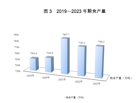 粮食产量。全年粮食产量7788.2万吨。其中,水稻、玉米和大豆分别为2440.0万吨、4379.0万吨和927.8万吨。全省粮食播种面积1474.3万公顷,其中,水稻、玉米和大豆分别为326.9万公顷、645.2万公顷和488.7万公顷。