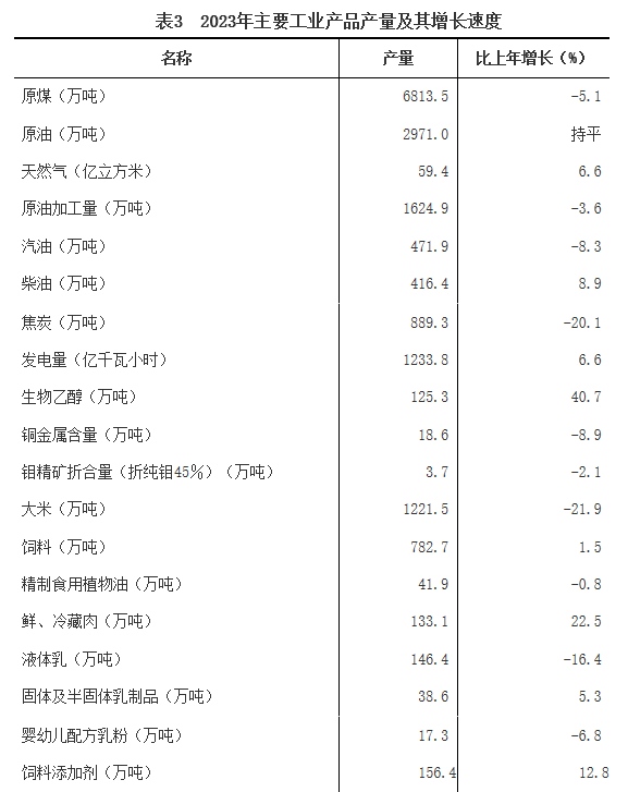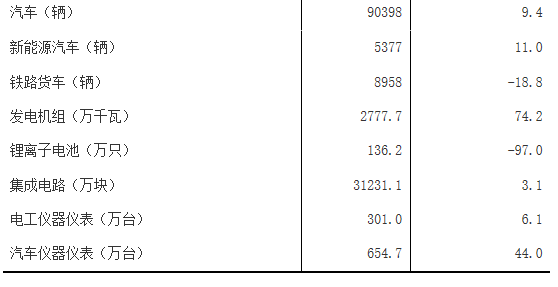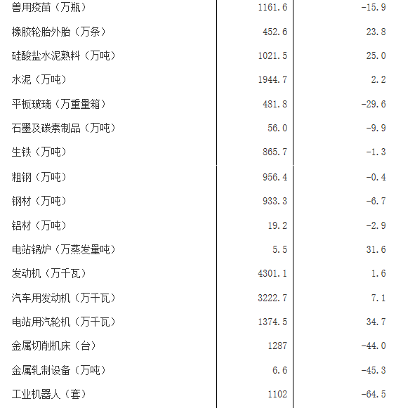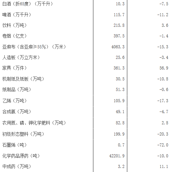 工业生产。全年规模以上工业企业4583个,比上年增长6.0%。规模以上工业增加值下降3.3%。从重点产业看,装备工业增加值同比增长5.8%,其中专用设备制造业、汽车制造业分别增长13.3%、4.9%;食品工业增加值下降4.3%,其中农副食品加工业、食品制造业分别下降7.4%、0.8%;能源工业增加值下降3.9%,其中石油和天然气开采业增长0.2%;石化工业增加值下降8.9%;医药工业、冶金工业增加值同比分别增长9.5%、4.6%。从产品产量看,在重点监测的工业产品中,增长较快的有:发电机组2777.7万千瓦,增长74.2%;家具361.3万件,增长56.9%;汽车仪器仪表654.7万台,增长44.0%;电站用汽轮机1374.5万千瓦,增长34.7%;硅酸盐水泥熟料1021.5万吨,增长25.0%;汽车90398辆,增长9.4%。