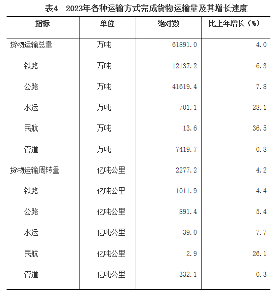 表4 2023年各种运输方式完成货物运输量及其增长速度
