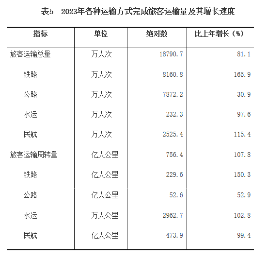 表5 2023年各种运输方式完成旅客运输量及其增长速度
