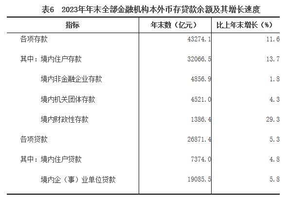 表6 2023年年末全部金融机构本外币存贷款余额及其增长速度