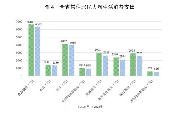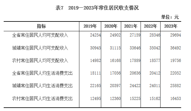 居民收入。常住居民人均可支配收入29694元,比上年增长4.8%。城镇常住居民人均可支配收入36492元,增长4.1%;农村常住居民人均可支配收入19756元,增长6.3%。常住居民人均生活消费支出22052元,增长8.0%。城镇常住居民人均生活消费支出25882元,增长7.8%;农村常住居民人均生活消费支出16453元,增长8.5%。