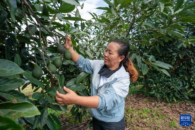 由企业在当地农民中培训的产业技术人员李美琼在一处牛油果种植基地检查待采的牛油果(10月29日摄)。新华社记者 陈欣波摄