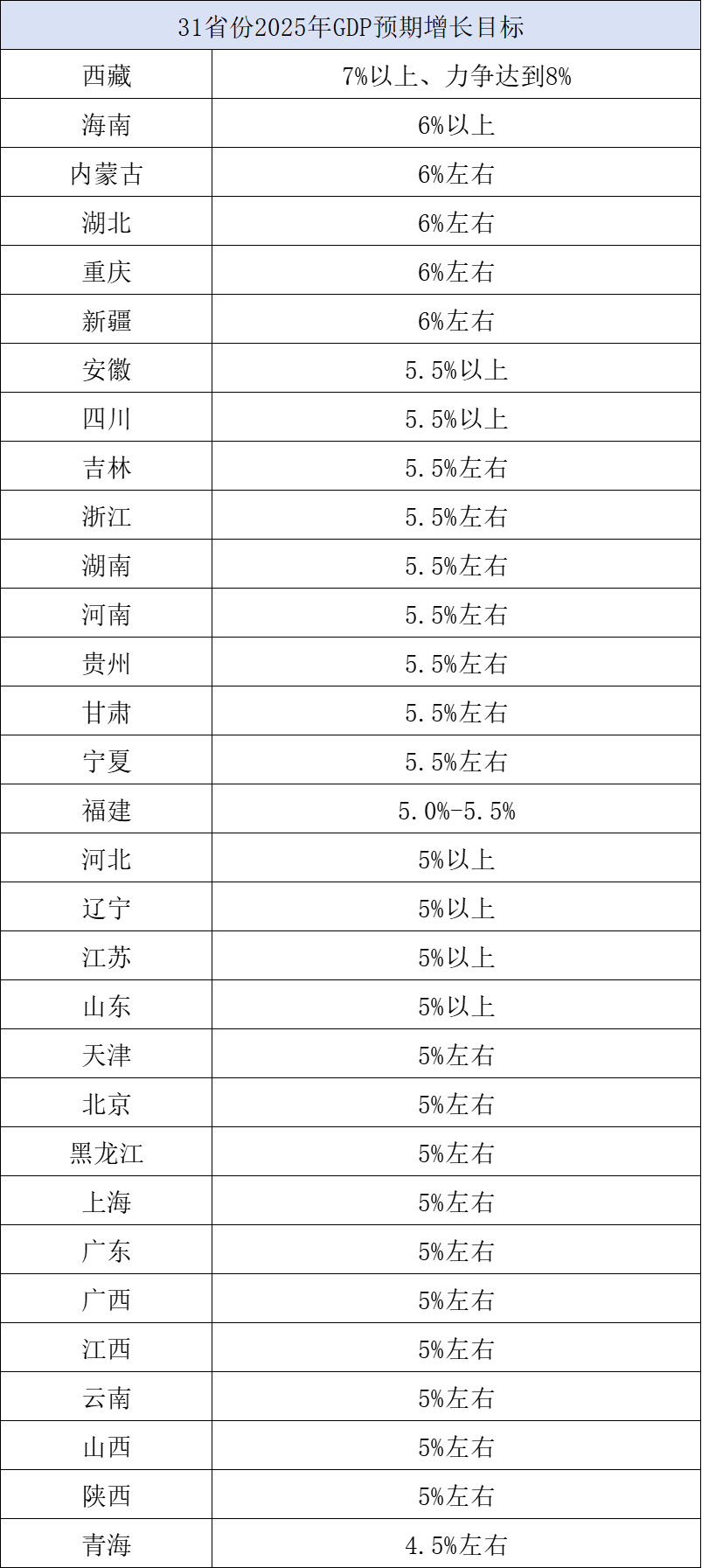 近日,全国多个省份密集进入“地方两会”时间。截至1月20日,全国31省份已全部召开两会,公布了2025年经济增长目标。