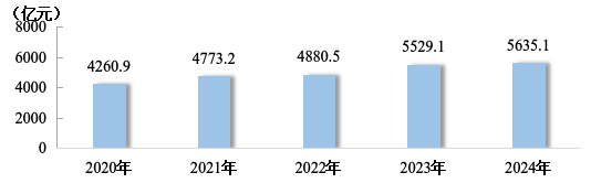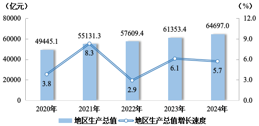 根据地区生产总值(GDP)统一核算初步结果,2024年四川省地区生产总值64697.0亿元,按不变价格计算,比上年增长5.7%。其中,第一产业增加值5619.9亿元,增长2.5%;第二产业增加值22816.9亿元,增长5.6%;第三产业增加值36260.2亿元,增长6.3%。三次产业对经济增长的贡献率分别为4.4%、35.1%和60.5%。三次产业结构由上年的8.9∶35.7∶55.4调整为8.7∶35.3∶56.0。人均地区生产总值77333元,增长5.7%。
