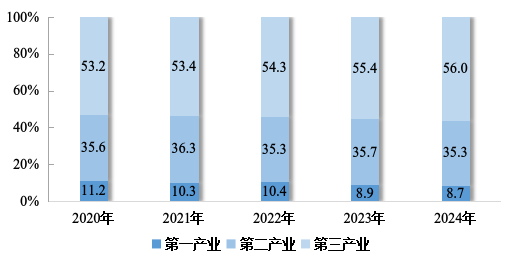 图2:2020~2024年三次产业增加值占地区生产总值的比重