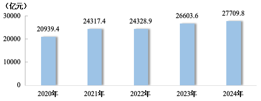 全年社会消费品零售总额27709.8亿元,比上年增长4.2%。按经营地分,城镇消费品零售额22476.4亿元,增长4.0%;乡村消费品零售额5233.3亿元,增长4.8%。按消费类型分,餐饮收入3884.1亿元,增长6.9%;商品零售额23825.6亿元,增长3.7%。限额以上企业(单位)通过互联网实现商品零售额1968.6亿元,增长11.4%。