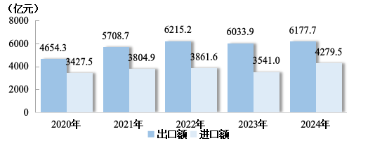 全年货物贸易进出口总额10457.2亿元,比上年增长9.4%。其中,出口额6177.7亿元,增长2.4%;进口额4279.5亿元,增长21.3%。