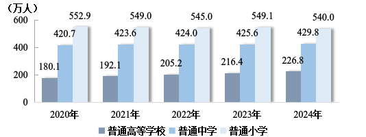 年末共有普通小学4947所,招生85.8万人,在校生540.0万人。普通初中3111所,招生94.7万人,在校生277.2万人。普通高中822所,招生52.5万人,在校生152.7万人。特殊教育学校140所,招生0.4万人,在校生(含附设特教班)2.1万人。中等职业教育学校(不含技工学校)317所,招生27.2万人,在校生79.6万人。