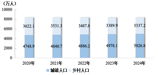 根据2024年全国人口变动情况抽样调查资料测算,全年全省常住人口出生人口53.6万人,人口出生率6.41‰;死亡人口78.9万人,人口死亡率9.43‰;人口自然增长率为-3.02‰。年末全省常住人口8364万人,比上年末减少4万人,其中城镇人口5026.8万人,乡村人口3337.2万人,常住人口城镇化率60.10%,比上年末提高0.61个百分点。年末全省户籍人口9060.5万人,比上年末减少10.9万人。