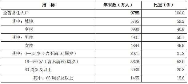 年末全省常住人口9785万人,其中城镇常住人口5795万人,乡村常住人口3990万人;常住人口城镇化率为59.22%,比上年末提高1.14个百分点。全年出生人口76.2万人,人口出生率为7.78‰;死亡人口77.3万人,人口死亡率为7.89‰;人口自然增长率为-0.11‰。