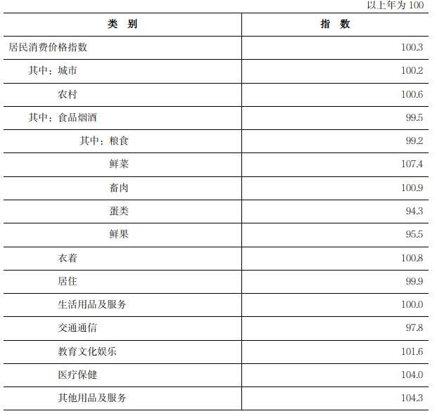 全年全省居民消费价格比上年上涨0.3%。工业生产者出厂价格下降1.8%。工业生产者购进价格下降3.2%。农产品生产者价格上涨1.3%。