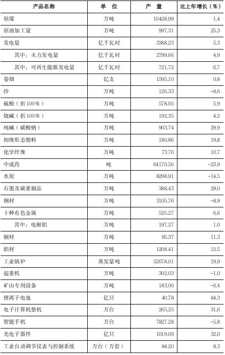 全年全省规模以上工业增加值比上年增长8.1%。分经济类型看,国有控股企业增加值增长4.4%;股份制企业增长8.6%,外商及港澳台商投资企业增长4.5%;私营企业增长8.6%。分门类看,采矿业增加值增长4.7%,制造业增长9.1%,电力、热力、燃气及水生产和供应业增长4.0%。分重点产业看,五大主导产业增加值增长10.8%,占规模以上工业增加值的比重为47.8%;传统支柱产业增长6.7%,占规模以上工业的48.3%;工业战略性新兴产业增长9.2%,占规模以上工业的24.8%;高技术制造业增长12.0%,占规模以上工业的14.0%;能源原材料工业增长6.9%,占规模以上工业的46.7%;消费品制造业增长3.0%,占规模以上工业的21.7%;“7+28+N”产业链群增长9.5%,占规模以上工业的63.2%。全年全省规模以上工业企业产品销售率96.9%。