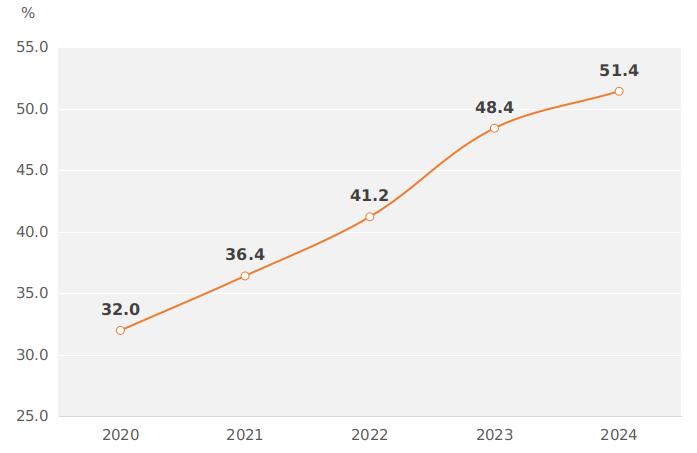 图5 2020-2024年河南省可再生能源装机容量占发电装机容量比重