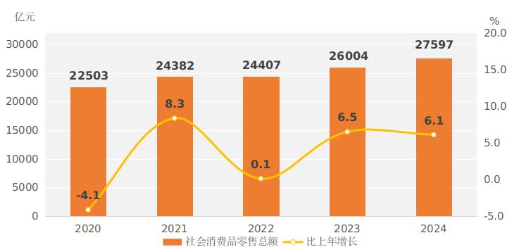 全年全省社会消费品零售总额27596.69亿元,比上年增长6.1%。分城乡看,城镇消费品零售额22937.31亿元,增长6.0%;乡村消费品零售额4659.38亿元,增长6.6%。
