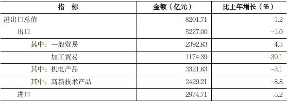全年全省货物进出口总值8201.71亿元,比上年增长1.2%。其中,出口5227.00亿元,下降1.0%;进口2974.71亿元,增长5.2%。