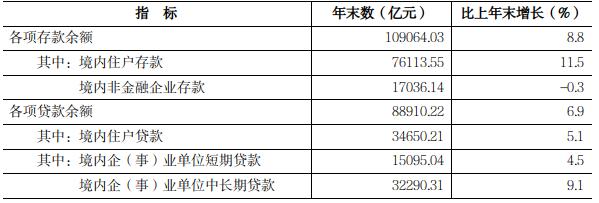 年末全省金融机构本外币各项存款余额109446.93亿元,比年初增加8862.04亿元,其中人民币各项存款余额109064.03亿元,增加8857.28亿元。金融机构本外币各项贷款余额89257.26亿元,增加5660.60亿元,其中人民币各项贷款余额88910.22亿元,增加5769.28亿元。
