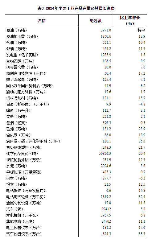 表3 2024年主要工业产品产量及其增长速度