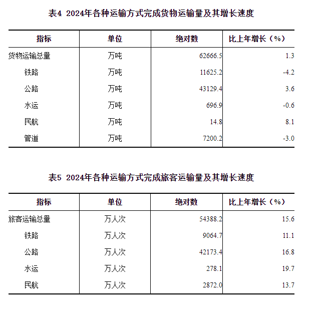 表4 2024年各种运输方式完成货物运输量及其增长速度
