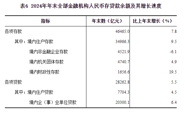 表6 2024年年末全部金融机构人民币存贷款余额及其增长速度