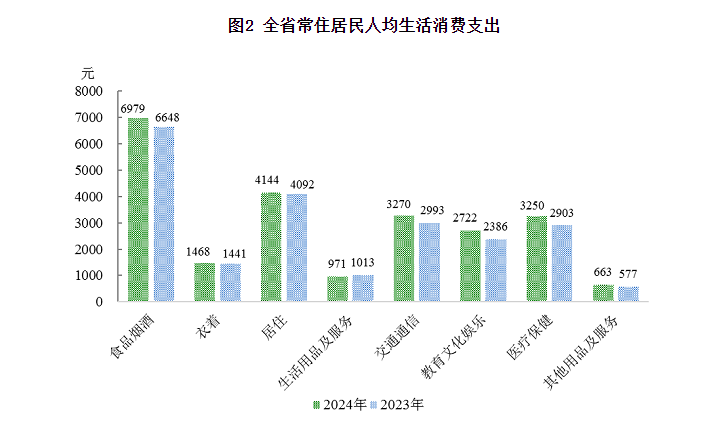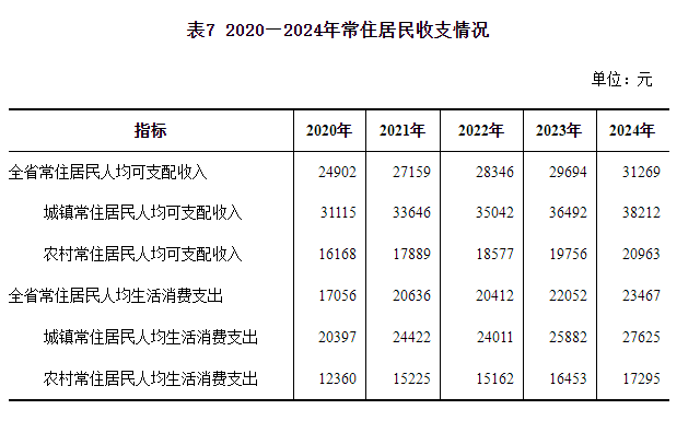 居民收入。全省常住居民人均可支配收入31269元,比上年增长5.3%。按常住地分,城镇常住居民人均可支配收入38212元,增长4.7%;农村常住居民人均可支配收入20963元,增长6.1%。常住居民人均生活消费支出23467元,比上年增长6.4%。按常住地分,城镇常住居民人均生活消费支出27625元,增长6.7%;农村常住居民人均生活消费支出17295元,增长5.1%。