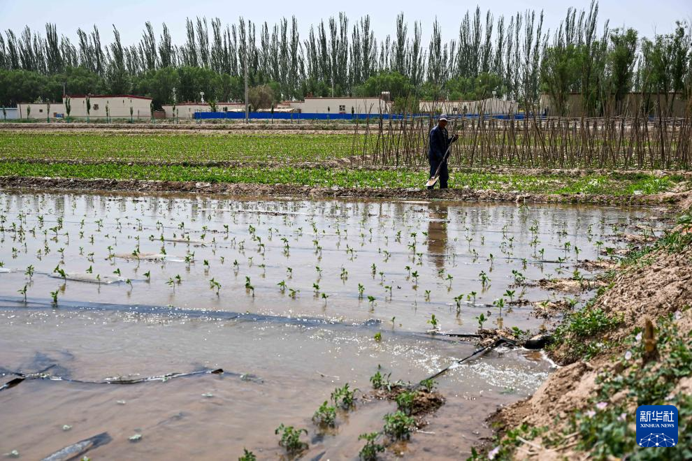 5月28日,巴彦淖尔市临河区农民在浇灌农作物。新华社记者 李志鹏 摄