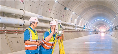 图为工作人员在金塘海底隧道内进行测量作业。