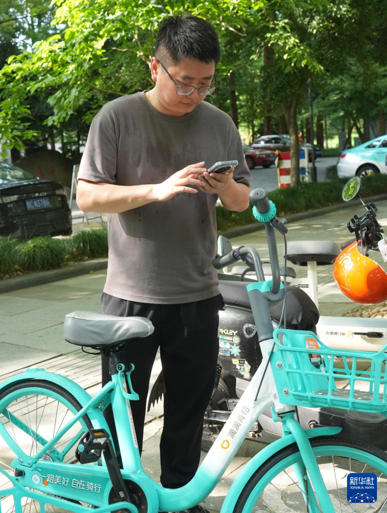 6月17日,市民在杭州西湖边扫码使用安装清凉坐垫的共享单车。