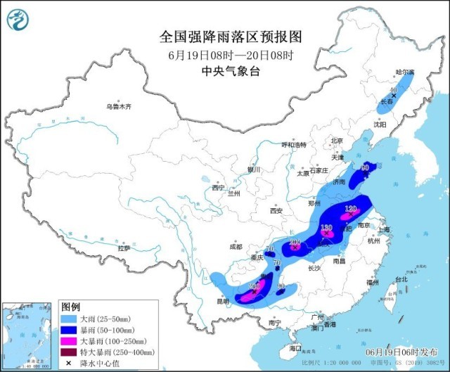 预计,6月19日8时至20日8时,黄淮中东部、江淮、江汉、重庆东部、湖南西部和北部、江西北部、贵州东部和南部、云南东部、广西北部等地部分地区有大到暴雨,其中,安徽中北部、江苏中部、湖北东北部和西南部、湖南北部、贵州南部、广西北部等地部分地区有大暴雨,贵州西南部等地局地特大暴雨(250~280毫米)。上述部分地区伴有短时强降水(最大小时降雨量20~50毫米,局地可超过80毫米),局地有雷暴大风等强对流天气。