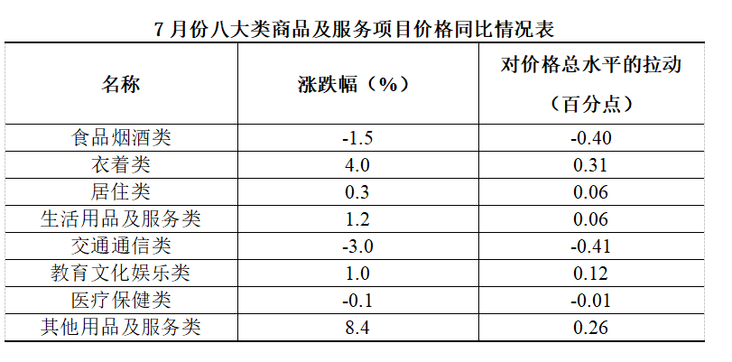 7月份八大类商品及服务项目价格同比情况表