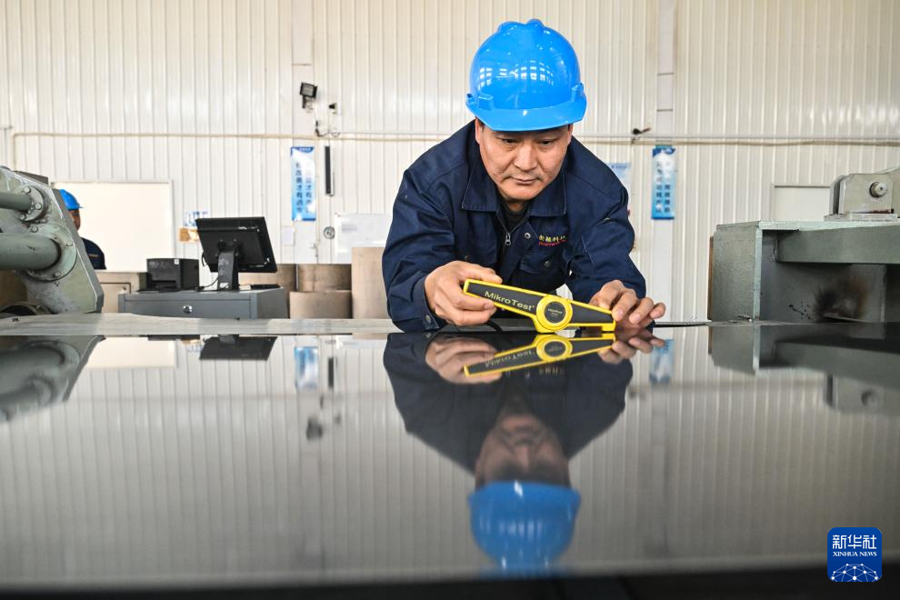 11月25日,在苏州新颖新材料科技股份有限公司冰箱面板自动化生产线,工人测量产品漆膜厚度。