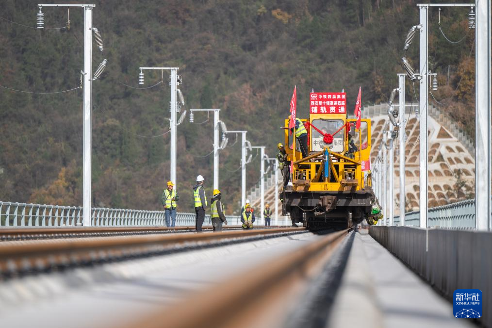 11月27日,在湖北十堰神定河特大桥上,西安至十堰高速铁路(简称“西十高铁”)全线最后一对长钢轨铺设落地,标志着西十高铁全线铺轨工程顺利完工,为后续联调联试奠定基础。