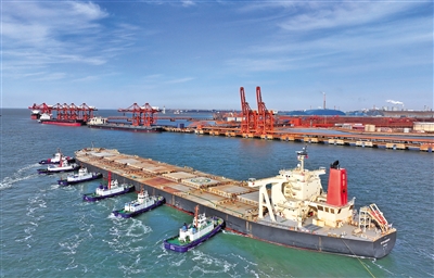 1月13日,一艘轮船在拖轮协助下向唐山港曹妃甸港区矿石码头靠泊(无人机照片)。记者从河北省唐山市海洋口岸和港航管理局获悉,2025年,唐山港全港完成货物吞吐量88399万吨,同比增长2.53%。新华社记者 杨世尧 摄