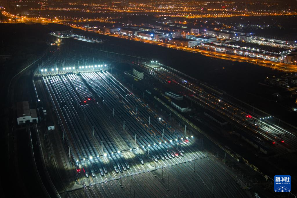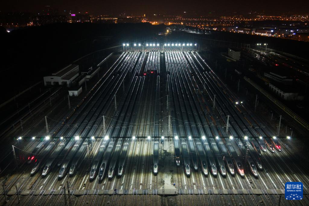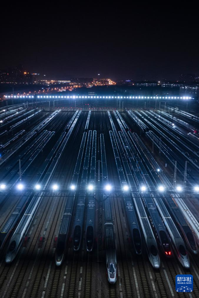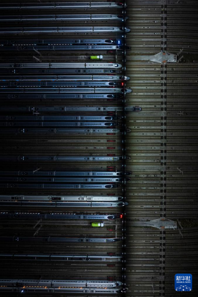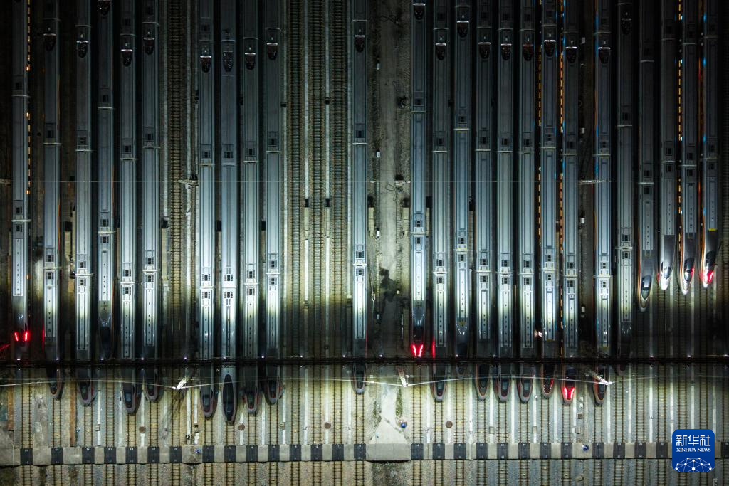 2月2日凌晨,检修完的动车组列车停靠在长沙动车运用所(无人机照片)。