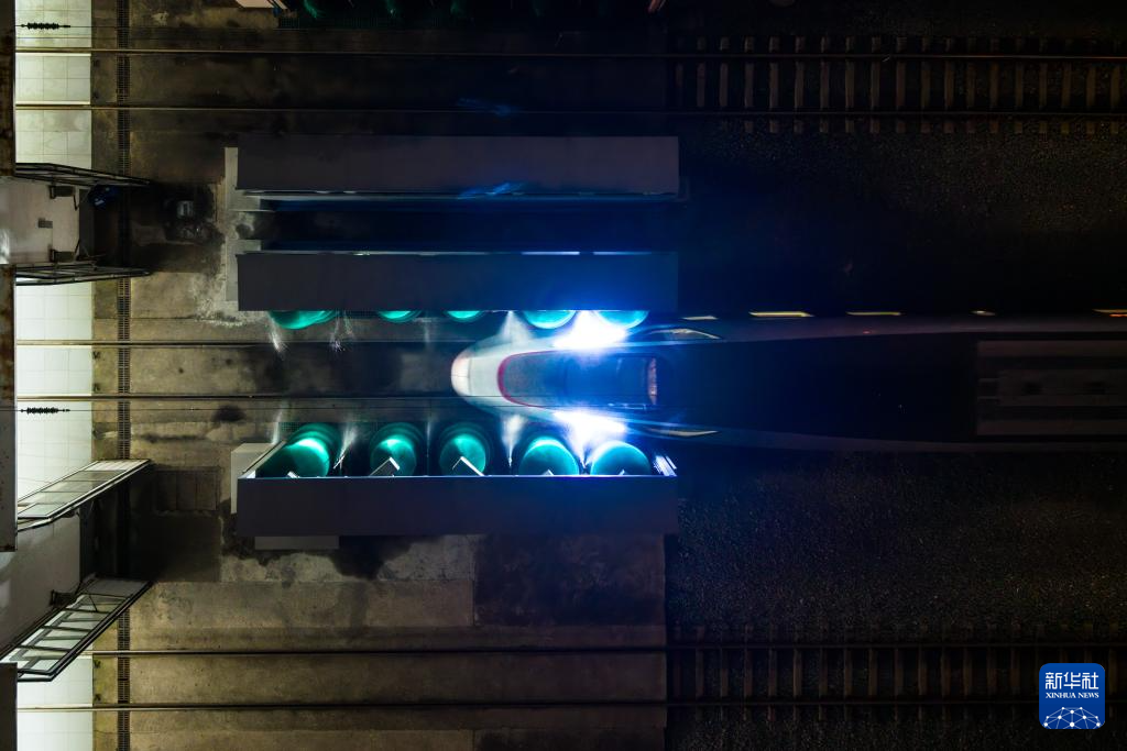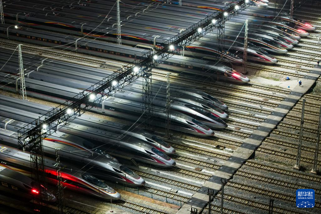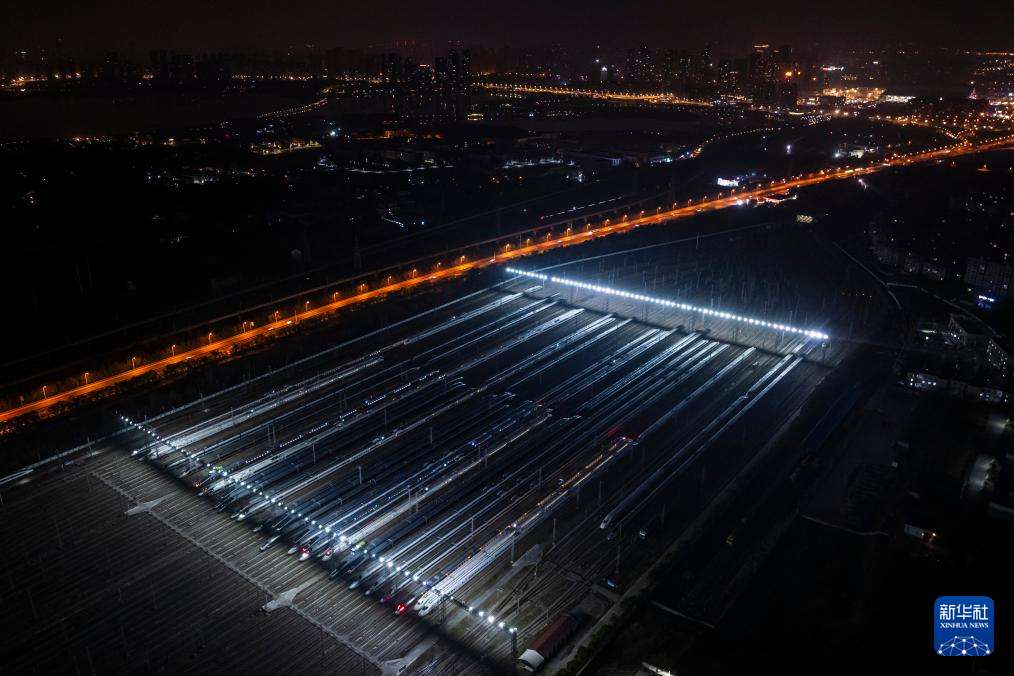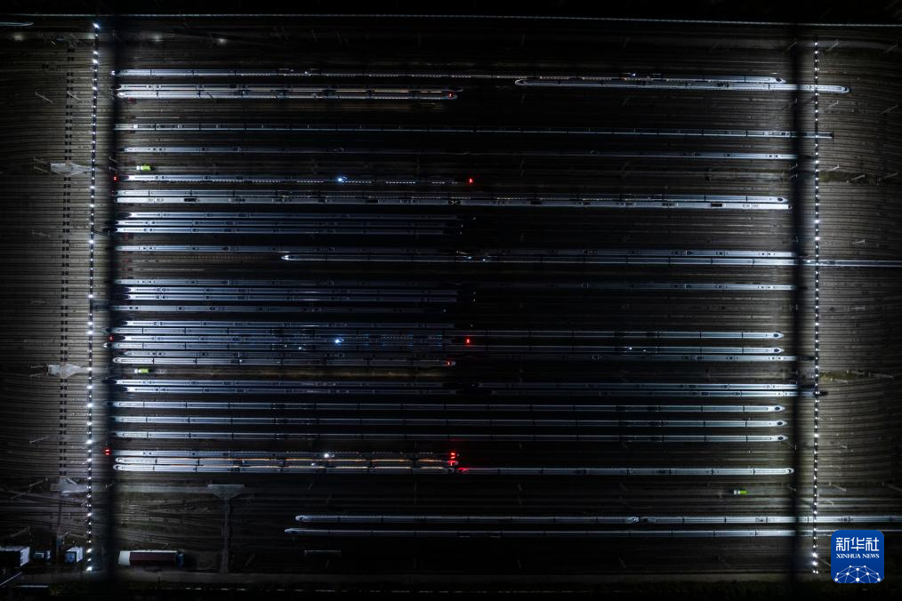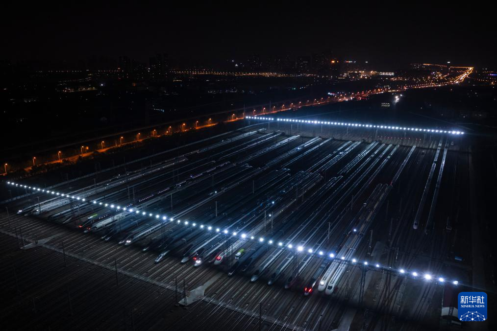 2月2日凌晨,检修完的动车组列车停靠在长沙动车运用所(无人机照片)。