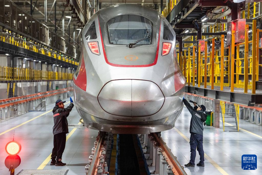 2月2日凌晨,机械师在长沙动车运用所检查动车组车体两侧情况。