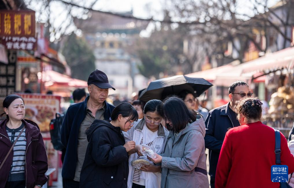 2月18日,游客在昆明市官渡古镇品尝官渡粑粑。